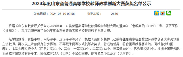 2024年4月12日至14日,由山东省教育厅主办的第四届山东省高校教师教学创新大赛现场决赛在山东师范大学落下帷幕,5月10日,获奖结果公示,我院张保国老师喜获新文科组一等奖,并成功晋级国赛!