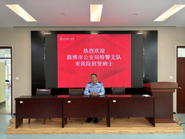 5月21日上午,淄博市公安局特警支队来我院进行毕业生人才交流活动,淄博市公安局特警支队二大队大队长张砚杰、教导员黄洪岭受邀参加,学院党委副书记、纪委书记曹绪亮,毕业班辅导员索罗丹,部分毕业班学生和低年级学生参与活动。活动由曹绪亮主持。