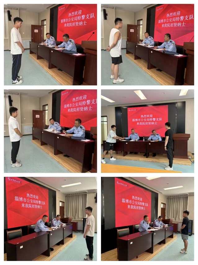 随后,淄博市公安局特警支队二大队大队长张砚杰和教导员黄洪岭对有意报名的毕业生进行现场面试。