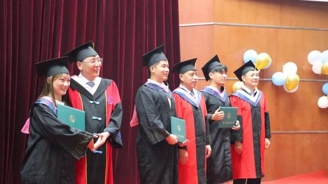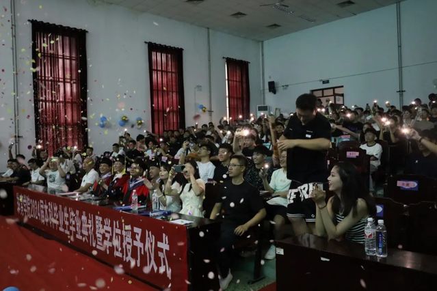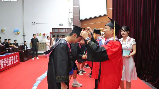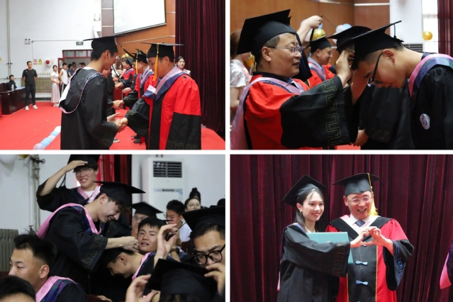 学院班子成员为毕业生授予学位证书,拨穗正冠、整理流苏。