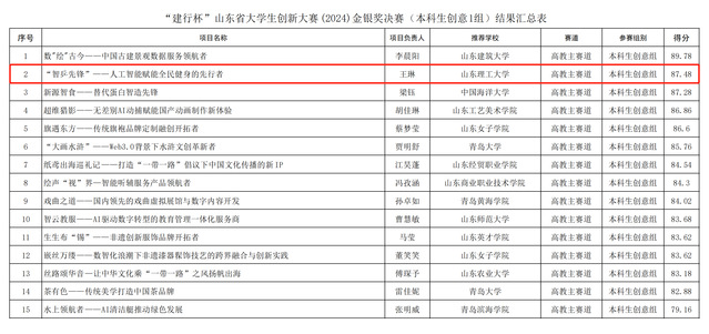 2024年7月24-25日,由山东省教育厅等13个部门联合主办的“建行杯”山东省大学生创新大赛(2024)决赛在山东大学中心校区落下帷幕。由我院党委副书记、纪委书记曹绪亮指导,运动2203班学生王琳负责的项目《智乒先锋--人工智能赋能全民健身的先行者》,经校赛推荐省赛网评、现场决赛,过关斩将,突出重围,荣获省赛金奖,取得我校在大学生创新创业A+类竞赛方面突破性成果。