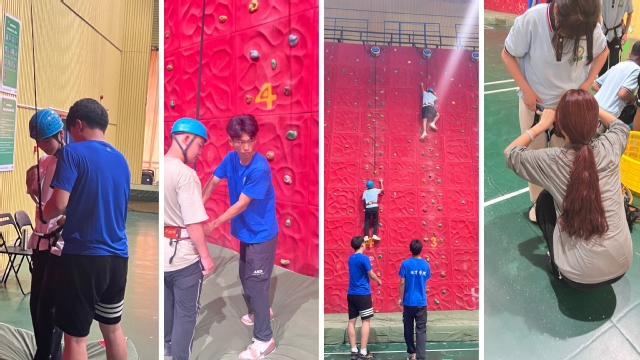 在攀岩课程中,团队成员对专业运动知识进行了讲解,结合课本知识进行受力分析,辅助同学们进行自主攀岩体验,并在旁做好安全保护措施。