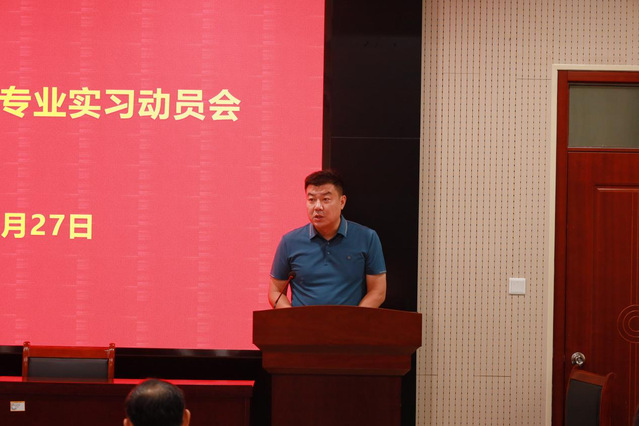 曹绪亮做动员讲话,他提到,一是他传授了如何快速适应实习环境,如何正确的与同事之间沟通交流,与指导教师相互配合顺利完成实习工作;二是要珍惜当下的实习机会,为毕业迈向工作岗位提前积累经验宝贵;三是希望全体实习生时刻保持良好的精神风貌,维护学校学院的良好形象,弘扬“出彩体育人”精神,并祝愿全体实习生实习顺利。