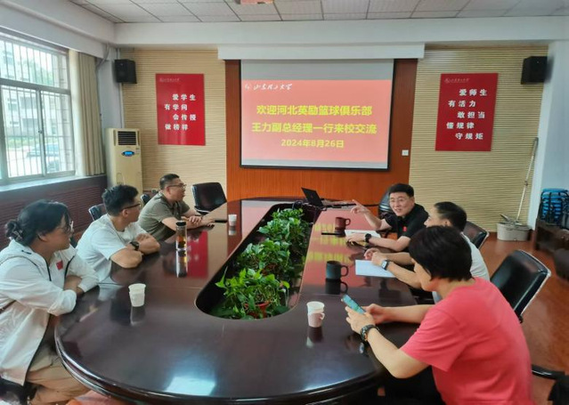 8月26日上午,河北英励篮球俱乐部王力副总经理一行3人来访我院,并于2号教学楼111会议室进行座谈交流。学院党委书记、院长韩长江,副院长杨刚,综合办公室主任张鹏,女篮主教练董婧老师参加座谈交流。