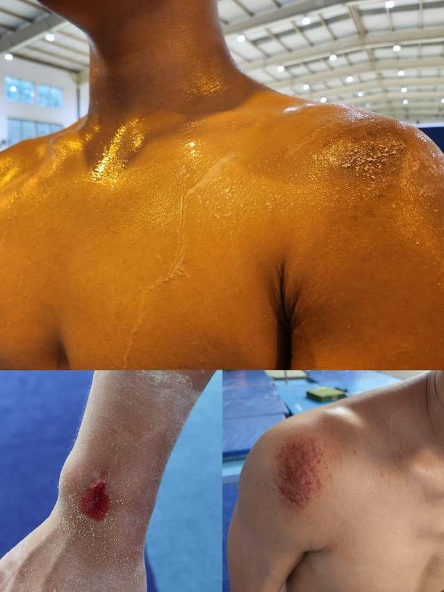 从5岁进行竞技体操运动训练的她,本就是一身伤病,但她从未因为伤病耽误任何一次比赛。山东省第23届健美操备赛期间比赛,身体突发状况做了手术,但是比赛日临近,刚做完手术3天的她坚持到训练场地指导训练。在2024年备战全国技巧冠军赛的训练中,为了让学生更直观、更精准的练习高难度抛接动作,她都是亲自保护学生,一次训练中学生做空翻抛接动作时偏了方向,因担心学生摔伤,她便奋不顾身的冲了上去保护学生,学生安全了,结果她却小腿肌肉拉伤撕裂、肌腱断裂,医生建议卧床静养,但是第二天她又依然按时出现在训练场地,当别人都担心她的身体状况时,她说:“我就坐在那里不动看着指导他们,这样心里才会更踏实。”此类事情在整个二十多年的教学训练中曾多次发生,但在学生的进步和取得的成绩面前,她都会泯然一笑,当做生活本应感受的调味剂。