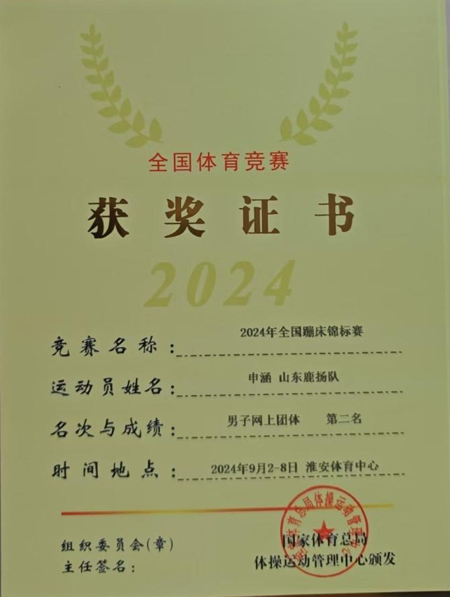9月5日至7日全国蹦床锦标赛在江苏淮安举行。我校2024级运动训练专业学生申涵,在本次比赛中表现优异,发挥良好竞技水平,随山东队在本次比赛中以总分171.45分,获得蹦床男子网上团体第二名的成绩。
