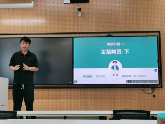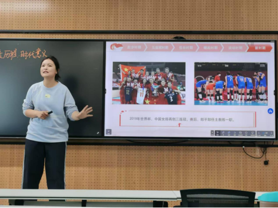 接下来,孙粼婧和卢海龙两位老师为大家带来了精彩的课堂展示。孙粼婧以“中国女排发展历程和时代意义”为主题,按照时间主线把中国女排从新中国建国以来的发展历程分为六个重要时期,并深入剖析了每一时期女排精神的重大时代意义;卢海龙以主裁判员的职责为主题,利用动图和视频进行了比赛案例判罚分析,并展示正确的判罚手势,同时结合主裁判应兼具的专业知识和职业素养等融入思政教育,教育学生执行裁判任务时要恪守公平公正执裁底线,营造和谐和睦比赛氛围。