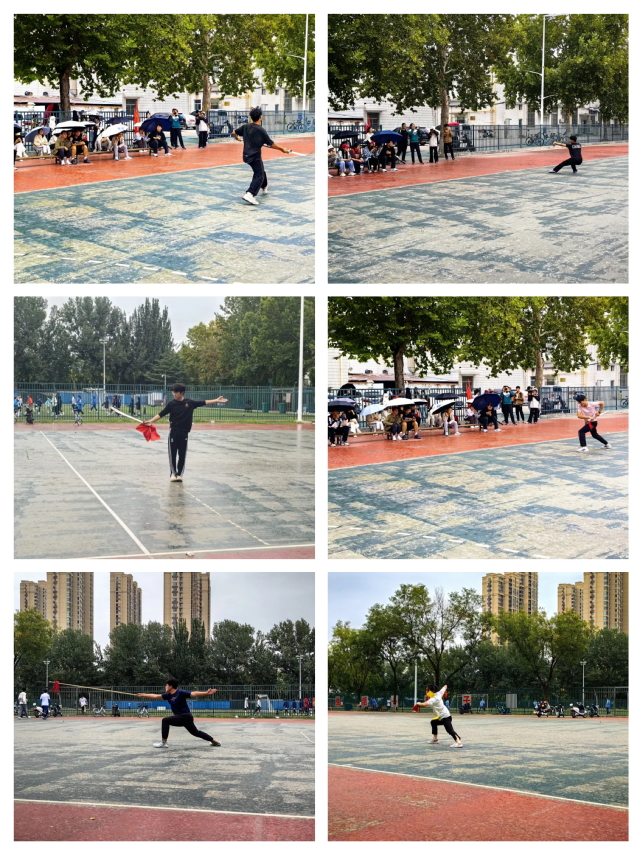 活动开场,虽然天空飘起了细雨,但却无法浇灭武术协会成员们对武术的热爱。他们摩拳擦掌、跃跃欲试,紧接着令人热血沸腾的表演正式拉开帷幕。成员们手持刀、枪、剑、朴刀等多种器械,依次闪亮登场。刀在雨中如猛虎下山,演练起来虎虎生风;枪似游龙出海、灵动迅猛,雨水顺着枪杆滑落,更增添了一份别样的美感;剑若飞凤翱翔、轻盈飘逸,剑影流转中尽显优雅灵动,雨滴在剑身上溅起微小的水花,仿佛为剑舞增添了灵动的音符;朴刀刚猛霸气,挥舞起来势可开天、威力十足。