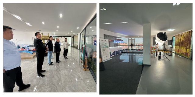 24日下午,赴威海市山东汉鼎体育用品有限公司和威海双蛇体育器材科技有限公司进行考察交流。负责人带领曹绪亮一行参观了办公区域、直播间、生产车间和运动体验室,详细介绍了企业文化、岗位需求、特色亮点、运营模式和产品结构等,并就下步深入合作达成共识。