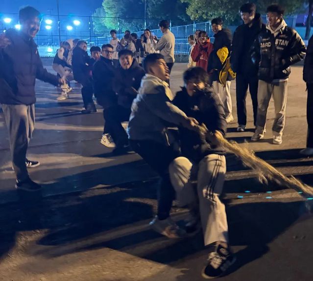 一根麻绳,连结同学情,凝聚团队力量,随着裁判的哨声响起,双方队员们将自己全部的热情与力气凝聚在一根绳上,团结一心、屏气凝神,为团队的荣耀不懈奋斗。一次次地拖拽后仰,手与绳紧紧连接,脚与地频频摩擦,赛场上的一举一动都牵动人心。