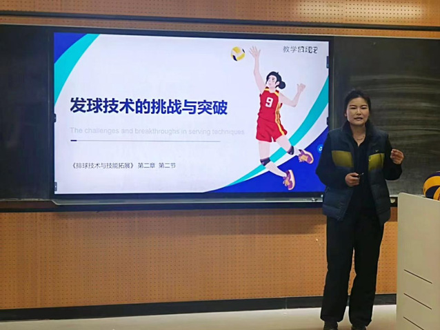 卢海龙和孙粼婧依次进行课堂教学展示。卢海龙讲授了羽毛球拍和球的发展变化史,以及如何根据温度、湿度和压力等因素的变化选择合适的羽毛球。孙粼婧通过比赛视频导入课堂,结合案例对排球发球技术动作进行分析,阐述了如何通过各种训练强化肌群力量,实现发球技术突破。
