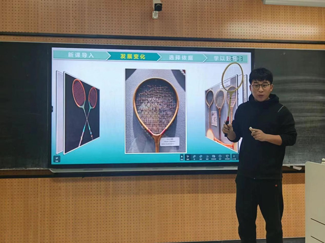 卢海龙和孙粼婧依次进行课堂教学展示。卢海龙讲授了羽毛球拍和球的发展变化史,以及如何根据温度、湿度和压力等因素的变化选择合适的羽毛球。孙粼婧通过比赛视频导入课堂,结合案例对排球发球技术动作进行分析,阐述了如何通过各种训练强化肌群力量,实现发球技术突破。