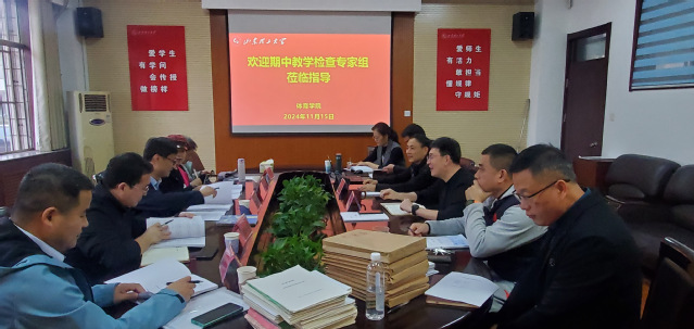 1115午,学校期中教学检查专家组一行5来我院进行2024-2025学年第学期期中教学检查。学院党委书记、院长韩长江,副院长杨刚,体育教育系主任胡鹏,运动训练系主任高博,实验管理中心主任张保国,教学工作办公室主任韩军梅,教学秘书高君、白倩倩加会议
