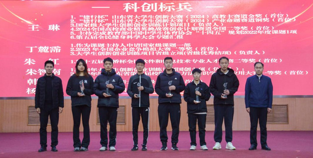 山东省山青世界青少年实践活动中心有限公司副总经理孟晓,校团委书记、创新创业学院院长王振为“科创标兵”颁奖。