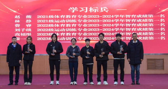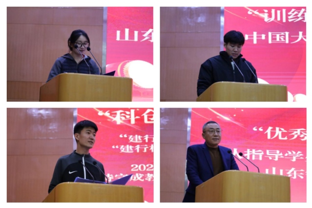 “学习标兵”学生代表赵薇,“训练标兵”学生代表刘子琰,“科创标兵”学生代表王琳,“优秀教练员”代表、校短跨队教练李继伟“优秀教师”代表、研究生与科研办公室主任高奎亭分别发言。