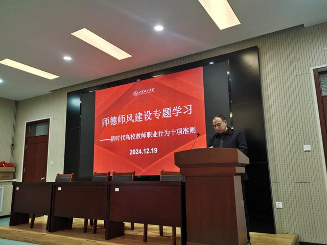 曹绪亮领学了《新时代高校教师职业行为十项准则》,他提到要筑牢师德师风底线,严守教师职业行为红线,做学生喜爱的“四有”好老师。