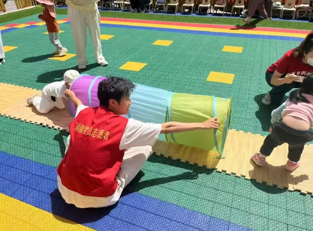 运动会开始后,志愿者们迅速分散到各个岗位。在“小小障碍赛”区域,志愿者们半蹲着身子,随时准备搀扶不小心摔倒的孩子,鼓励他们勇敢站起来继续比赛;在亲子游戏环节,志愿者耐心地指导家长和孩子完成游戏任务,用手机为他们记录下温馨瞬间。