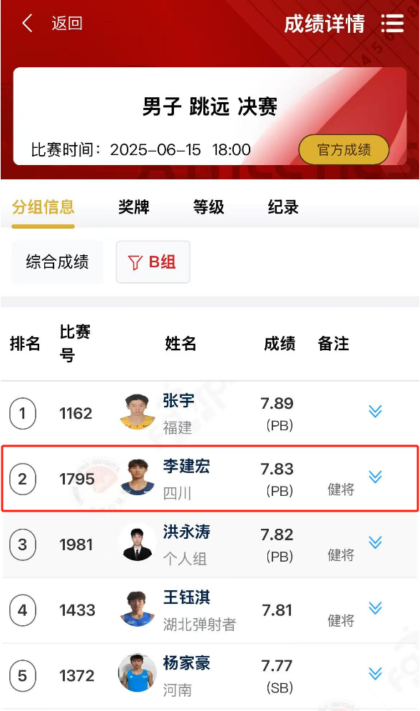 关键之年,全力冲刺。面对备战全运会的关键时期,李建宏早早进入高强度训练状态。今年春节期间,他主动放弃休假,无一日间断训练,即便在与伤病的对抗中也未曾松懈。这份付出在赛季初即见成效——室内赛中他多次刷新个人最好成绩并勇夺季军。此次室外赛首秀即克服身体不适,突破7.80米大关并荣膺“运动健将”称号,无疑是为全运会征程迈出的坚实一步,也再次证明了他强大的抗压能力与意志品质。