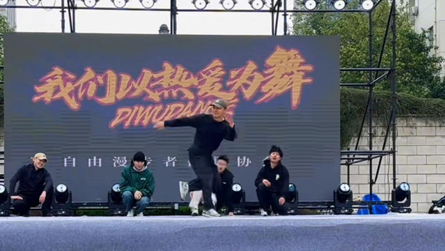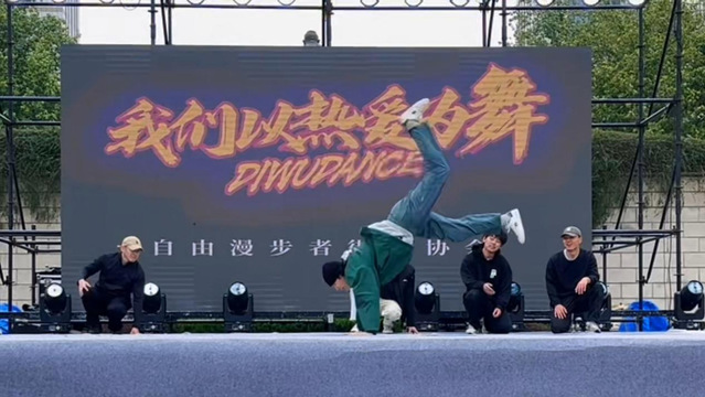 当第一个音符炸开,Breaking舞者率先出击!他们如猎豹般突进,手掌撑地时带起一阵风,身体瞬间完成“定格”——双腿在空中划出凌厉弧线,整个姿态既充满力量感,又带着街舞特有的不羁张力。 地板动作同样流畅衔接,旋转时,身体似被无形的力场牵引,在地面划出潇洒圆圈;翻滚间,肢体如弹簧般迸发弹性;倒立时,整个人如扎根舞台的“人形旗帜”,稳稳撑起力量与平衡的美感……每一个技巧都精准利落,仿佛重力都为他们让步,将Breaking“地板舞”的狂放与技巧性展现得淋漓尽致。 围观人群中爆发出第一波欢呼,有人忍不住拿出手机,镜头紧紧追着舞者的身影,生怕错过任何一个精彩瞬间。