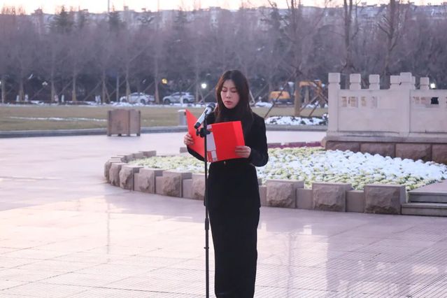 随着仪式开始,国旗护卫队身着笔挺制服,在微曦中迈着铿锵正步走向升旗台。队员们肩线齐整,脸颊冻得微红却满是坚毅,沉稳有力的步伐尽显学子的昂扬锐气。寒风里,护旗手的袖标与胸前校徽相映成景,全场师生肃立注目,现场氛围庄重肃穆。