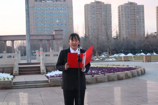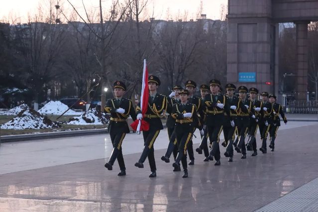 随着仪式开始,国旗护卫队身着笔挺制服,在微曦中迈着铿锵正步走向升旗台。队员们肩线齐整,脸颊冻得微红却满是坚毅,沉稳有力的步伐尽显学子的昂扬锐气。寒风里,护旗手的袖标与胸前校徽相映成景,全场师生肃立注目,现场氛围庄重肃穆。