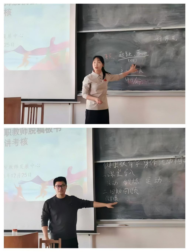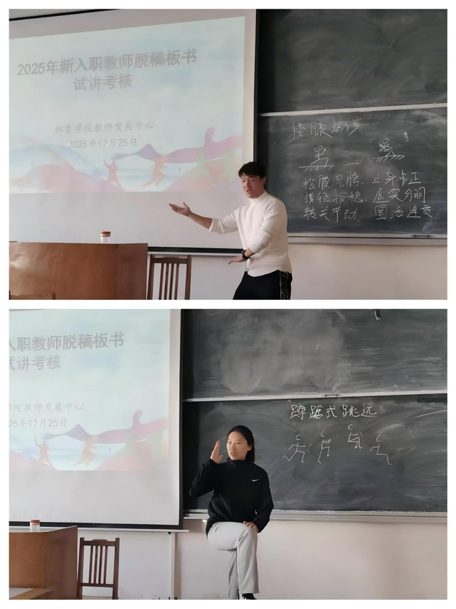 为检验2025年新入职教师“三段一线”培训第一、二阶段的培训成效,帮助新教师夯实教学基本技能,熟悉教学业务流程,全面提升教学质量,12月25日,我院教师发展中心在1号楼306教室组织开展2025年新入职教师脱稿板书试讲考核。本次考核由学院教学办公室主任韩军梅主持,教学督导宋杰老师、国家一流课程负责人王小迪老师、运动训练系主任高博老师、青教赛一等奖获得者阚世超老师、教授委员会主任张海斌老师担任评委,各系部专任教师到场参会学习。