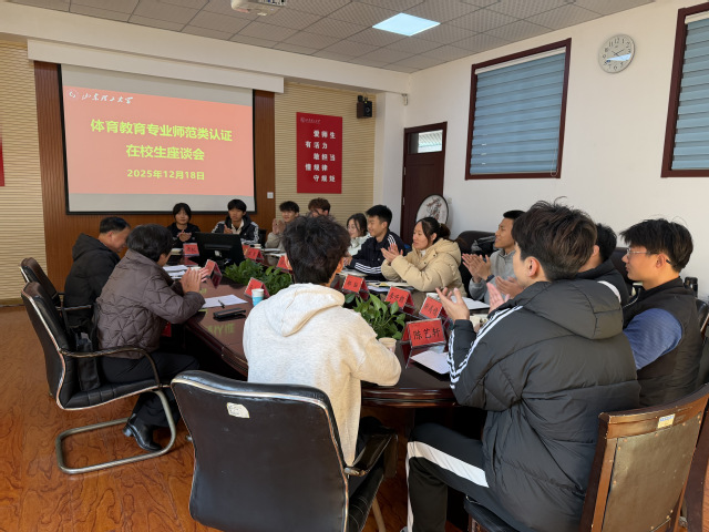 体育教育专业层面专家见面会在我院2-111会议室召开,会议由体育教育专业认证专家组组长王庆军教授主持,山东省教育科学研究院师范类专业认证中心主任唐文秀、副校长陈靖、教务处副处长王平、学院领导班子和专业负责人参加会议。学院副院长杨刚作专业补充说明汇报,专家组围绕专业考查重点进行问题循证。
