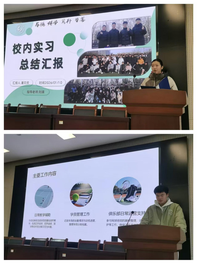 随后,七位优秀实习生代表依次登台分享实习成果。潘文欣立足校内健美操助教岗位,深化了对体育教学的理解;刘子琰融合多专项技能设计训练方案,诠释“体医融合”内涵;孙子豪全程参与马拉松赛事运营,在应急处理中积累实战经验;陈军面向零基础社会学员开展足球教学,展现出色的教学适应能力;周颂扎根乡村小学,自制教具、组建兴趣小组,带领跳绳队斩获区级奖项;李宇泰在足球俱乐部搭建球员评估体系,用专业建议降低球队伤病率;辛美琪则在篮球俱乐部策划公益项目,让职业体育彰显社会责任。实习生们在分享收获的同时,也剖析了问题不足并提出改进方向。