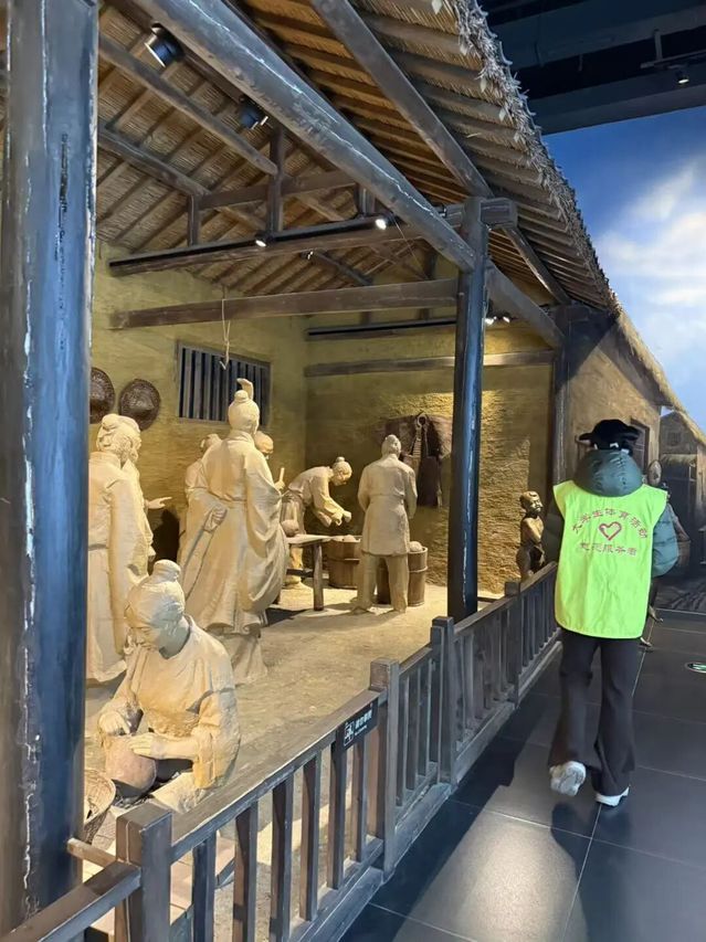 接着我们来到民俗体育复原展区,这里用雕塑还原了古代民间蹴鞠的日常场景:茅草屋下,老者盘腿而坐观战,年轻人赤脚奔跑传球,孩童在一旁嬉笑追逐。我沿着木质栈道慢慢走过,仿佛穿越回千年前的临淄街巷,能听见蹴鞠碰撞的清脆声响,也体会到民俗体育文化扎根生活的鲜活生命力。