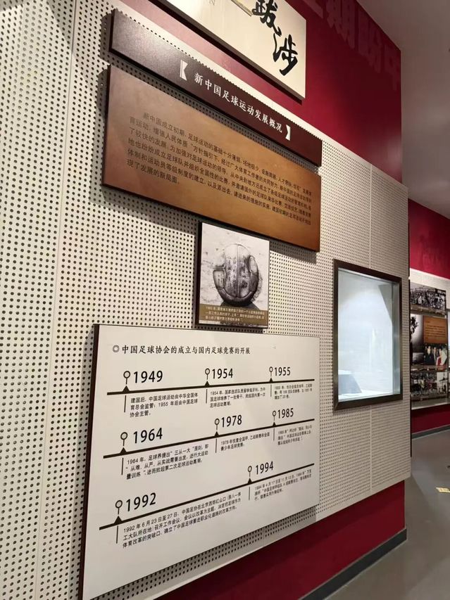 在“新中国足球运动发展概况”展区,我们对着时间轴展板展开热烈讨论:从1949年新中国足球由全国体委监管,到1992年红山口会议确立职业化改革方向,再到1994年甲A联赛开启,每一个时间节点都印证着中国足球的探索与奋进。作为体育专业学生,我尤其关注1964年“三从一大”训练原则的提出,这让我联想到自己平时的训练,更深刻理解了体育精神的传承。